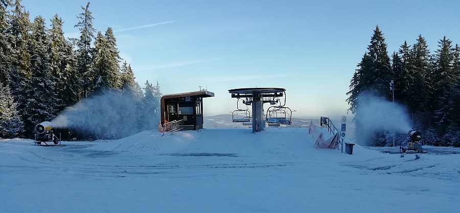 17. 11. se na Zadově výrazně ochladilo a ranní déšť přešel v odpoledních hodinách ve sněžení. Díky ochlazení jsme již také mohli dnes v ranních hodinách, poprvé v této sezoně, vyzkoušet zasněžovací systém a vyrobit první "kubíky" technického sněhu
